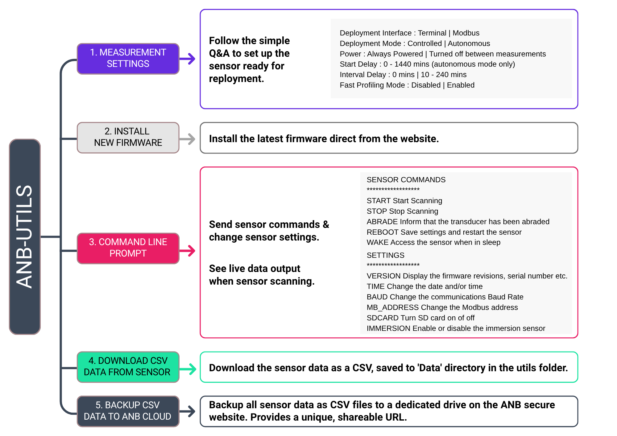 With anb_utils, you can access the full range of sensor functions, adjust measurement settings via an interactive configuration wizard, and view real-time data. It also allows you to download CSV files for detailed analysis, backup data to the cloud, upgrade sensor firmware, and ensure smooth operation for all your water quality monitoring needs.