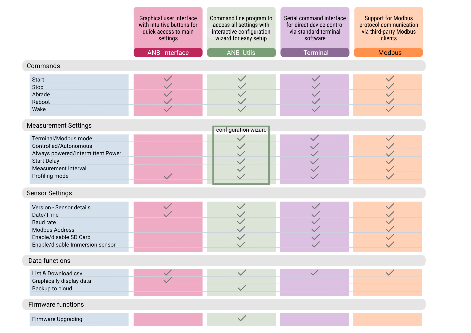 Comprehensive instructions for communicating with the sensor, using either ANB_Interface, ANB_Utils or a serial terminal, along with the Modbus protocols, are provided in the relevant sections of the User Guide.